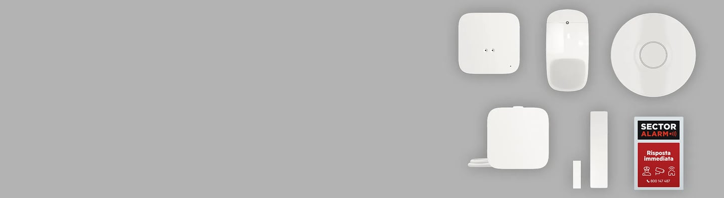 In tutti i pacchetti Sector Alarm abbiamo inserito un rilevatore di fumo, due rilevatori di movimento con fotocamera, un rilevatore d'urto e contatto per porte e finestre e una unità vocale portatile.
